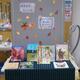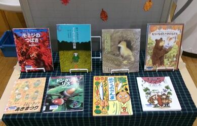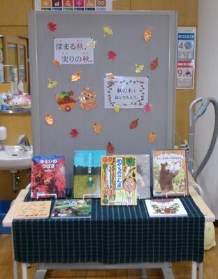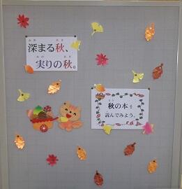 図書室の装飾が11月仕様になっています。赤や黄色,茶色に色付いた葉っぱが散りばめられています。