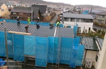 <12月25日(木)> 雨降りのあいにくの天気でしたが,作業員の皆さんが屋根の上で作業をしていました。