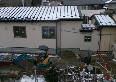 <2月10日(火)> 建物外側の工事が再開しました。土を掘ってトラックで運びだしていました。