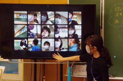 1年生がお互いが離れた場所にいても担任を中心として一緒に学習できるアプリ「グーグルミート」の使い方を学習しています。