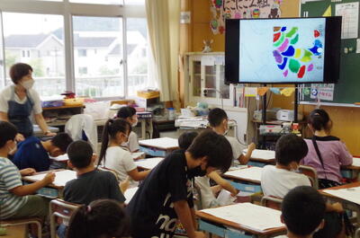 感染症予防のため、鍵盤ハーモニカやリコーダーなど吹奏楽器は教室では使用できない状況が続いていますが、2年生がタブレット画面上の鍵盤に触れると実際に音の出るアプリを使って練習をしています。