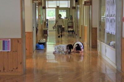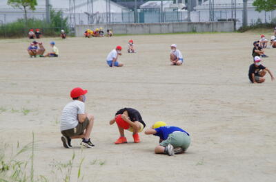 校庭は危険な「落下物」「転倒物」「衝突物」が少ないので比較的安全です。いたずらに校舎に戻らず、しゃがんで揺れが収まるのを待ちます。