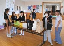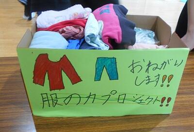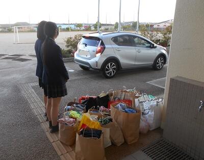 多くのご家庭のご協力をいただき,着なくなった服がたくさん集まりました。集めた服は本プロジェクトを中心となって推進している宮城県富谷高等学校の生徒さんに預けました。(学校を代表して教頭がお渡ししました。)