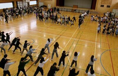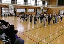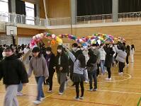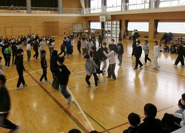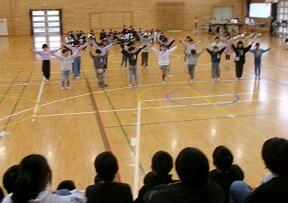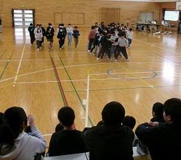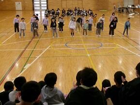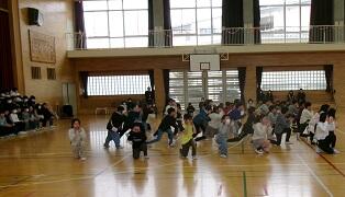 (7)6年生からのお礼の出し物です。全校児童で成小ソーランを踊りました。とても盛り上がりました。その後,卒業式で歌う歌を披露しました。きれいなハーモニーが響きました。