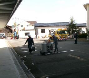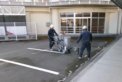 <2月24日(火)> 体育館と校舎の間の駐車場に白線を引きました。また,建物の外周にコンクリートを流すための囲いができていました。夕方には現場事務所も撤去されていました。