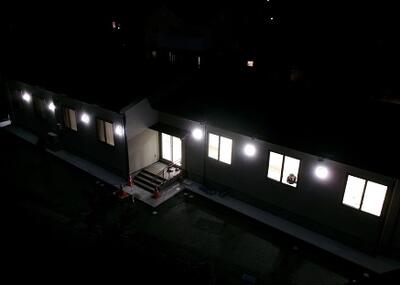 夜間も街灯が点いて明るくなりました。建物の内部では,まだ工事が続いているようです。